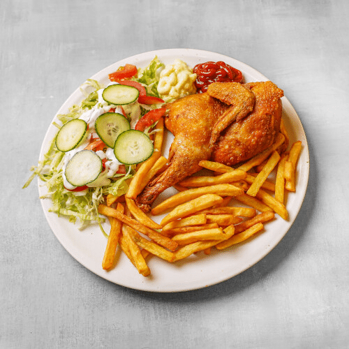 1 stk med pommes frites, mixed salat og hvidløgssmør